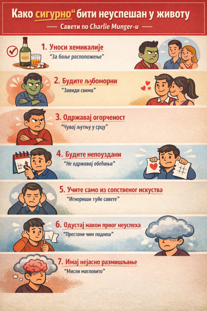 Charlie Munger, познати инвеститор, филантроп и дугогодишњи партнер Warren Buffett-а, једном је приликом држао необичан завршни говор на Harvard School (1986). Уместо савета како бити срећан или успешан, Munger намерно износи како сигурно бити неуспешан и несрећан у животу — кроз инверзију традиционалних савета и назначавање навика које воде у несрећу.