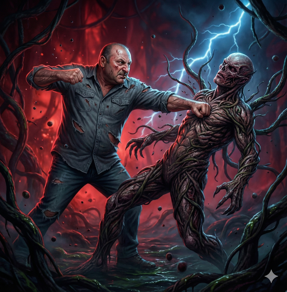 Make me another one where the person in the image fights Vecna. Vecna and the person should face each other and person should be giving the final blow to Vecna. Positioning of the person should look like it is a real fight.