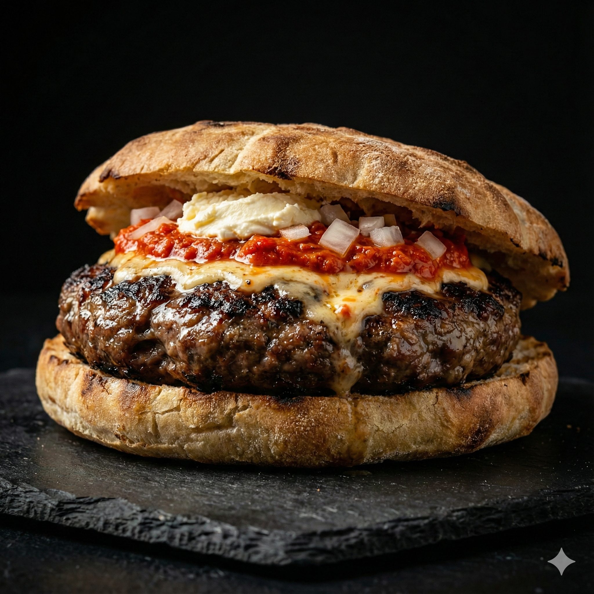 Create a high-resolution square (1:1) food poster of serbian dish [NAZIV VAŠEG JELA]. Present it with realistic, mouthwatering textures and vibrant colors. Place it against a deep black backdrop with dramatic professional studio lighting, rich depth of field, and high contrast. Emphasize the premium, luxurious, and visually impactful feel. Exclude any hands, people, text, logos, or distracting tableware. Поправљање постојеће слике