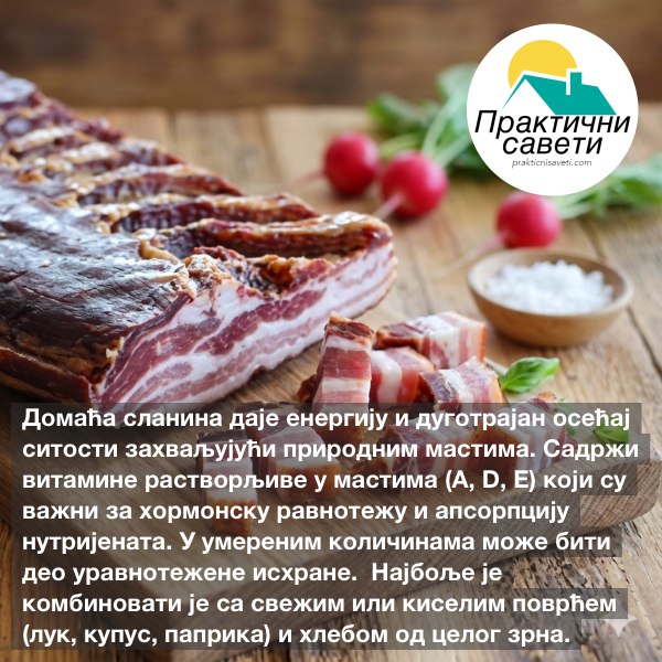 Домаћа сланина даје енергију и дуготрајан осећај ситости захваљујући природним мастима. Садржи витамине растворљиве у мастима (A, D, E) који су важни за хормонску равнотежу и апсорпцију нутријената.